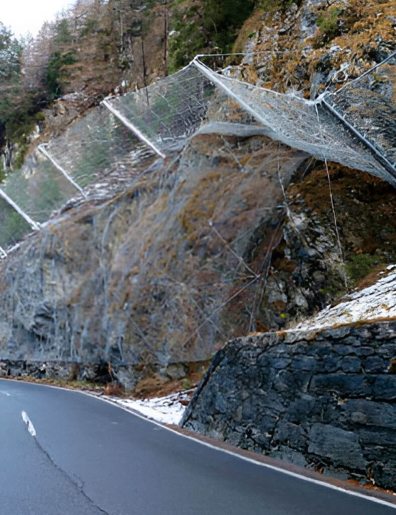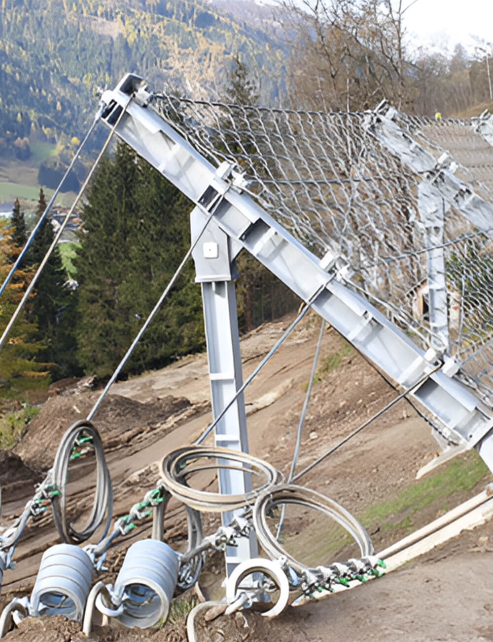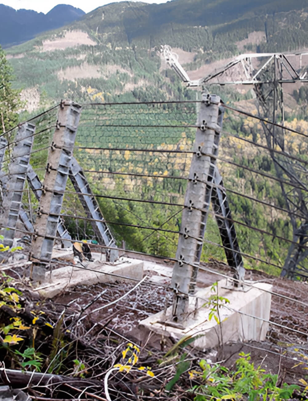 Geoquest Products offers engineered solutions to protect infrastructure, and assets from debris flows and debris floods. The threat of climate change raising the global temperatures, potentially causes a change in weather patterns, thawing of permafrost areas, increasing wildfires, debris flows, and shallow landslide activity. The use of flexible-net barriers can be an efficient alternative to the other traditional and costly mitigation measures such as dams and other rigid barriers. Each debris flow protection system is designed on a site-to-site basis, based on a thorough understanding of the debris flow characteristics.